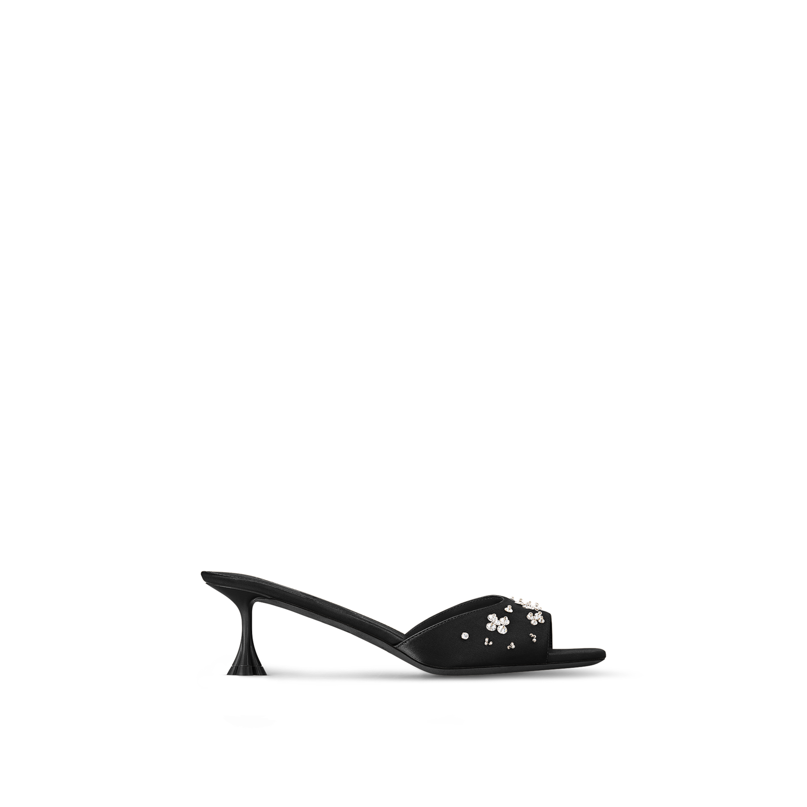 Sparkling embroidered motifs inspired by Louis Vuitton’s emblematic Monogram Flowers adorn the satin strap of the Blossom mule. This sophisticated, feminine style comes on a kitten heel in the shape of a round Monogram Flower. This model has a fine leather outsole and a padded insole for added comfort.